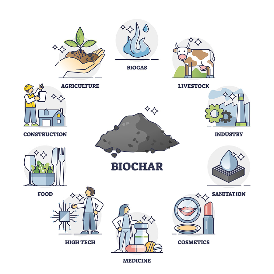Una volta ottenuto il pellet esso viene valorizzato attraverso la gassificazione pirolitica, un processo di decomposizione(sublimazione) termochimica ottenuto mediante l’applicazione di calore e in assenza di un agente ossidante (es. ossigeno). La pirogassificazione è particolarmente interessante poiché da un lato è altamente efficiente, sfruttando il 90% della biomassa, dall’alto presenta bassissime emissioni grazie all’assenza di ossigeno che permette di inibire l’emissione di CO e CO2. Al contrario, questi ultimi vengono catturati all’interno dei materiali residui della pirogassificazione, conferendo loro proprietà particolari che li rendono tutt’altro che uno scarto da dismettere, ma piuttosto un vero e proprio nuovo prodotto: il Biochar. Quest’ultimo è rinomatamente considerato un ammendante di altissima qualità non solo perché è ricco di carbonio e sostanze nutritive per il terreno, ma anche per la sua capacità di trattenere l’umidità nel terreno e accrescere la vita microbica.